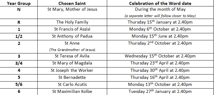 On, or near to, the Feast day, parents and carers will be invited into school to share in a short prayer and reflection time, to learn about their child's Class Saint with them. A letter will be sent out near to the time.